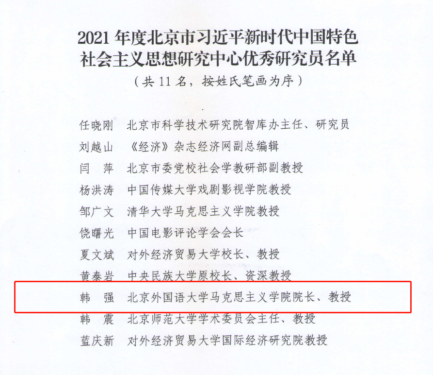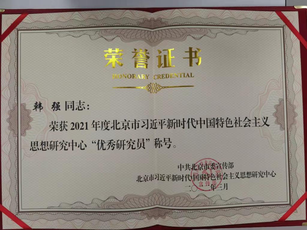 我院韩强教授获评2021年度北京市习近平新时代中国特色社会主义思想研究中心优秀研究员