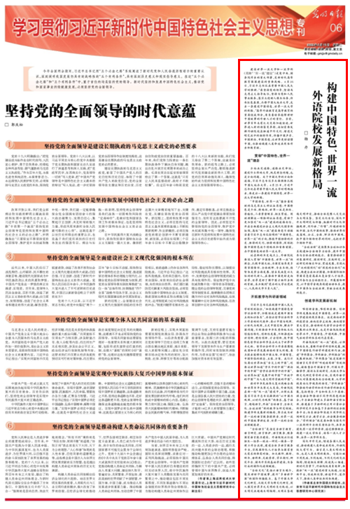 5月10日,《光明日报》第6版“学习贯彻习近平新时代中国特色社会主义思想专刊”刊登了北外校长、北京市习近平新时代中国特色社会主义思想研究中心北京外国语大学基地研究员杨丹的文章:《构建中国特色、世界一流外语院校发展新格局》。