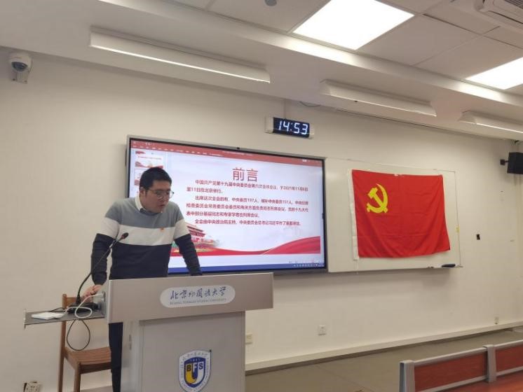 支部书记冯高洋带领大家系统学习了十九届六中全会公报的主要内容,提出要理论联系实际、以史为鉴深入学;结合专业知识、突出学术素养重点学;锤炼政治品格,提高政治意识主动学,在新时代展现马院担当,体现党员风采,作出伟大贡献。