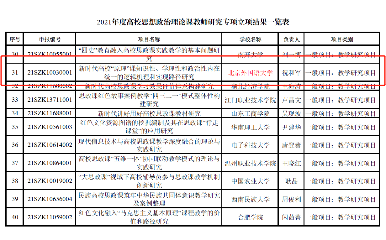 近日,教育部社科司正式公布了2021年度高校思想政治理论课教师研究专项立项名单,我院祝和军副教授申报的“新时代高校“原理”课知识性、学理性和政治性内在统一的逻辑机理和实现路径研究”课题获得“一般项目:教学研究项目”立项资助,项目编号为:21SZK10030001。