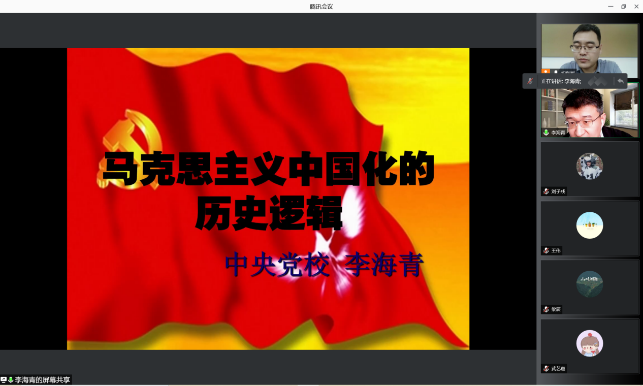 10月28日下午,北外马院马克思主义讲堂第五期活动在线上进行。中共中央党校亚洲国产精品无码久久影院马克思主义中国化研究所所长、博士生导师、中央党校创新工程首席专家李海青教授以“马克思主义中国化的历史逻辑”为题做了精彩讲座。本次讲座由亚洲国产精品无码久久影院党总支书记祝和军主持。