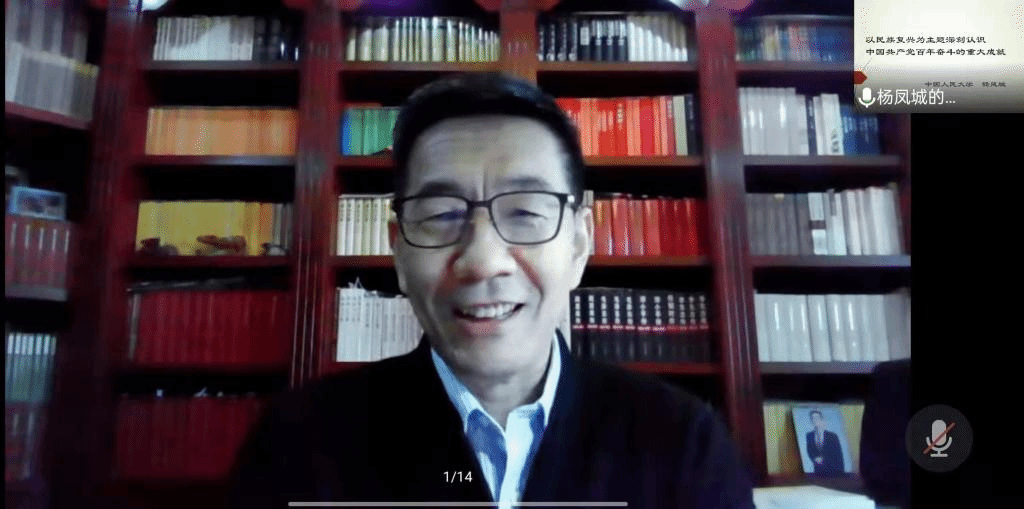 12月31日下午,北外马克思主义讲堂第七期活动在线上举行。国务院政府特殊津贴专家、教育部“长江学者”特聘教授、中国人民大学中共党史党建研究院执行院长杨凤城教授以“以民族复兴为主题深刻认识中国共产党百年奋斗的重大成就”为题做了专题讲座。此次会议共有校内外师生170余人参加,会议由北京外国语大学亚洲国产精品无码久久影院院长韩强主持。