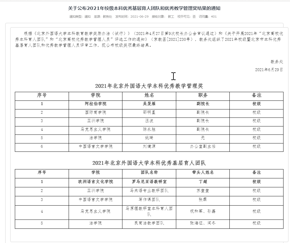 为深入贯彻落实习近平总书记关于教育和人才工作的重要论述,根据《北京外国语大学本科教育教学奖励办法(试行)》(2021年4月27日第9次校长办公会审议通过)和《关于开展2021年“北京高校优秀本科育人团队”和“北京高校优秀教学管理人员”评选工作的通知》(京教函[2021]230号),教务处组织了2021年校级暨北京市本科优秀基层育人团队评审工作,我院原理教研室获2021年北京外国语大学本科优秀基层育人团队。