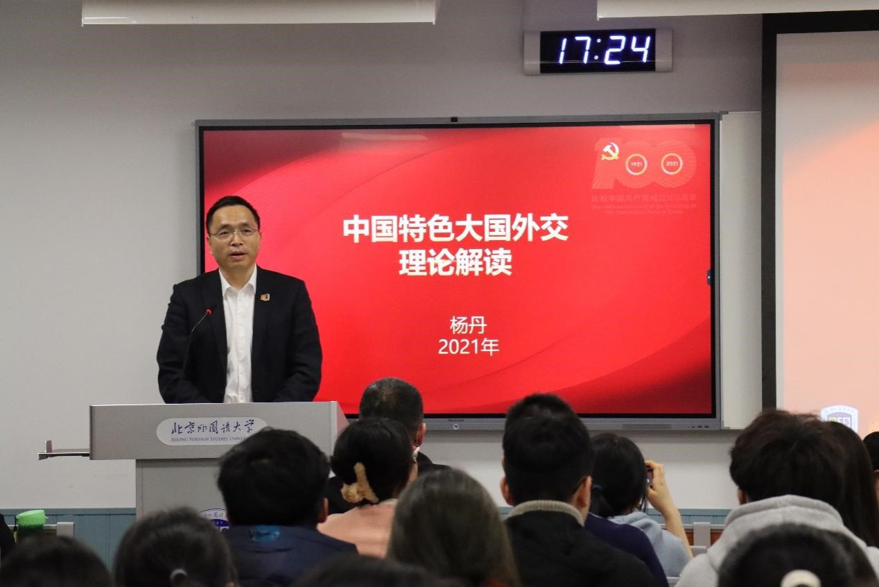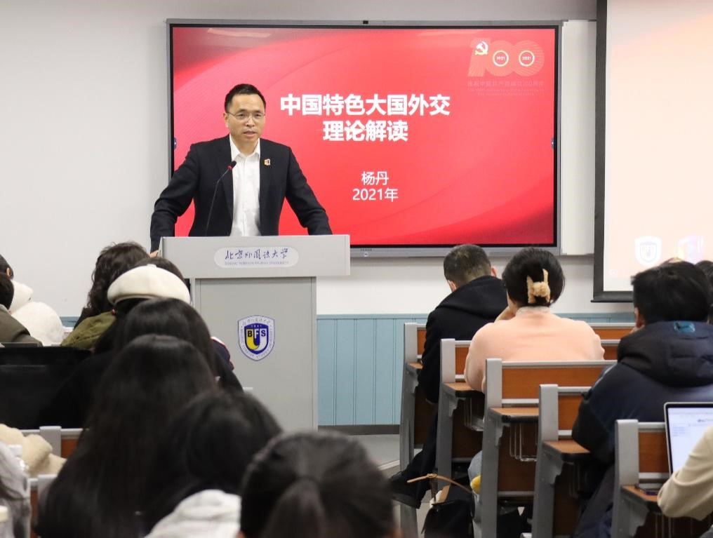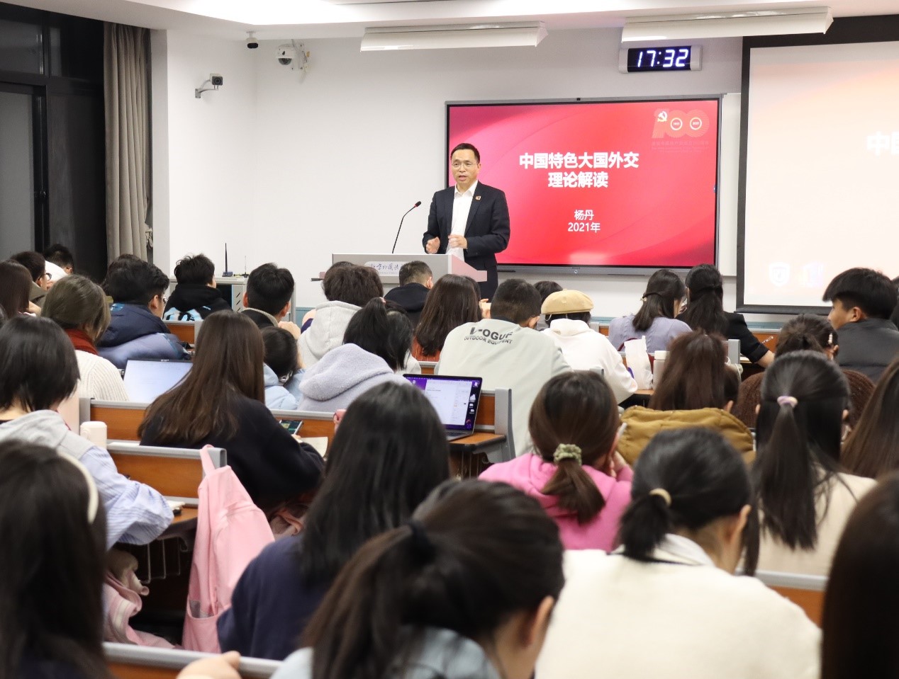 12月8日,北京外国语大学校长、党委副书记杨丹教授在逸夫楼为国际商学院2021级本科生讲授了题为《中国特色大国外交的理论解读》的形势与政策专题课。