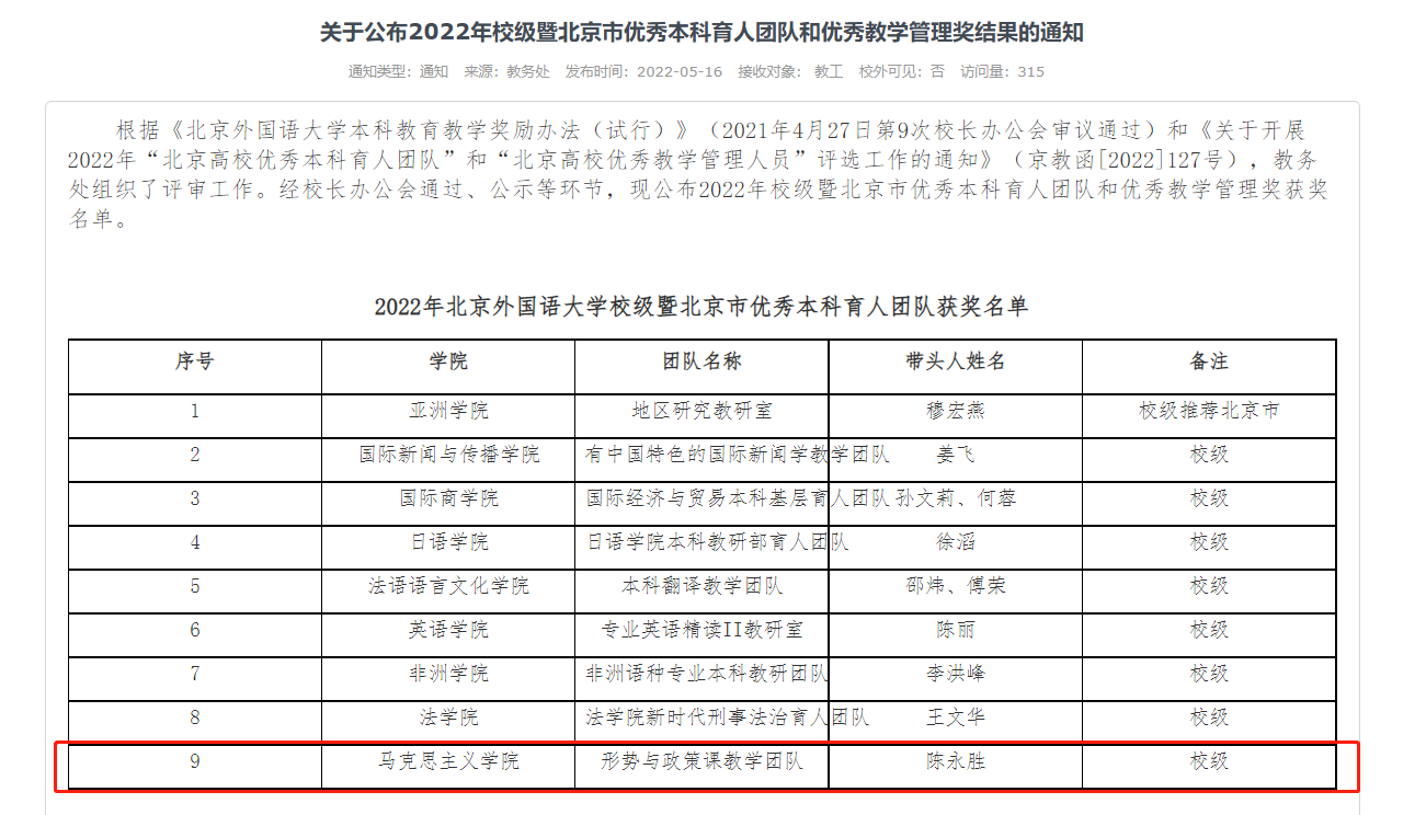 经教务处评审,校长办公会通过、公示等环节,由我院陈永胜副教授牵头的形势与政策教学团队入选北京外国语大学2022年校级优秀本科育人团队。