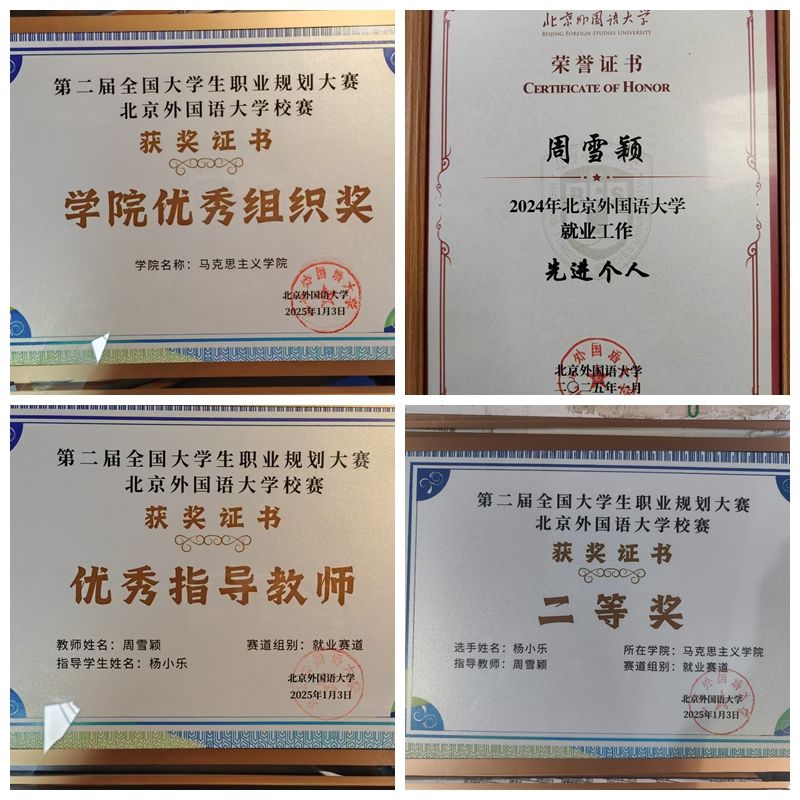 2025年1月9日,北京外国语大学召开2024年就业创业工作总结会。会上,学校对2024年就业创业工作中表现突出的先进集体和个人进行了表彰。亚洲国产精品无码久久影院获得第二届全国大学生职业规划大赛北外校赛优秀组织奖;马院办公室主任周雪颖获得2024年就业工作先进个人。