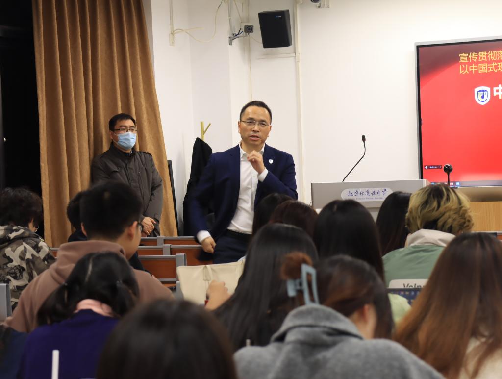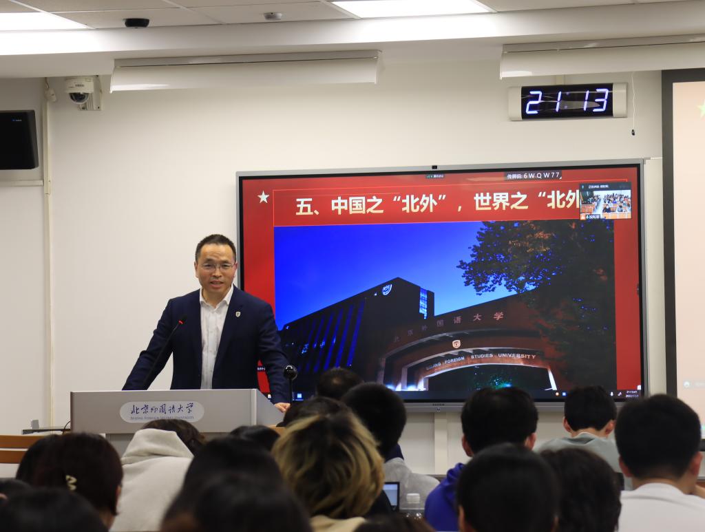11月9日,北京外国语大学校长、党委副书记杨丹在逸夫楼503教室为亚洲学院、德语学院2021级本科生讲授题为《中国特色大国外交理论解读》的形势与政策专题课。