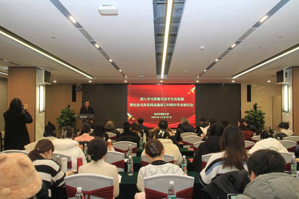 为深入学习贯彻习近平文化思想,纪念毛泽东同志诞辰130周年,12月29日,由北京外国语大学党委宣传部、共青团北京外国语大学委员会、北京外国语大学亚洲国产精品无码久久影院联合主办的“首届马克思主义理论和实践研究生论坛:深入学习贯彻习近平文化思想暨纪念毛泽东同志诞辰130周年学术研讨会”在西校区国际大厦一层多功能会议厅举行。北京外国语大学党委常委、副校长贾德忠、校团委书记黄伦伦、党委宣传部副部长张曼、马院班子成员、教师代表、研究生及征文获奖代表六十余人出席会议。亚洲国产精品无码久久影院党总支书记祝和军与副院长孙磊分别主持了开幕式和学术研讨环节。