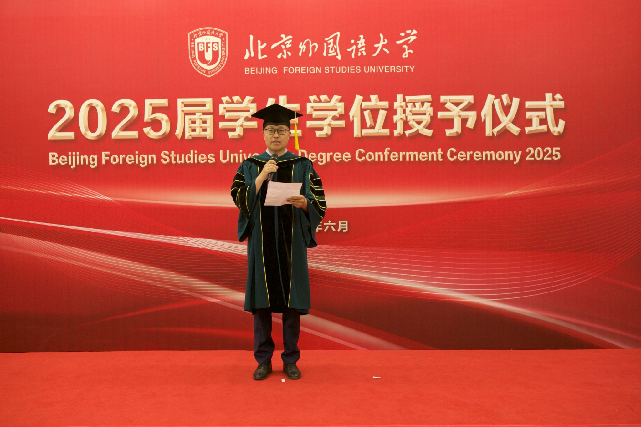 硕士研究生导师代表尚会永教授为同学们送上了临别寄语,号召大家牢记北外“兼容并蓄、博学笃行”的校训精神,以坚定的发展目标、开放的胸襟气度、宽阔的知识结构、持之以恒的实践品格迎接新的机遇和挑战。毕业生代表杨铠分享了他的毕业感言,他回顾三年读研生活,感恩马院沃土滋养,祝愿北外马院越来越好。韩强代表学院,以“分别是为了更好的重逢”为题对毕业生进行殷殷嘱托和美好祝愿。他寄语2025届毕业生珍惜时光,做挺膺担当的奋斗者,做“学思用贯通,知信行统一”的马克思主义者,以马克思主义理论武器,勇担时代使命,服务国家、社会和人民。