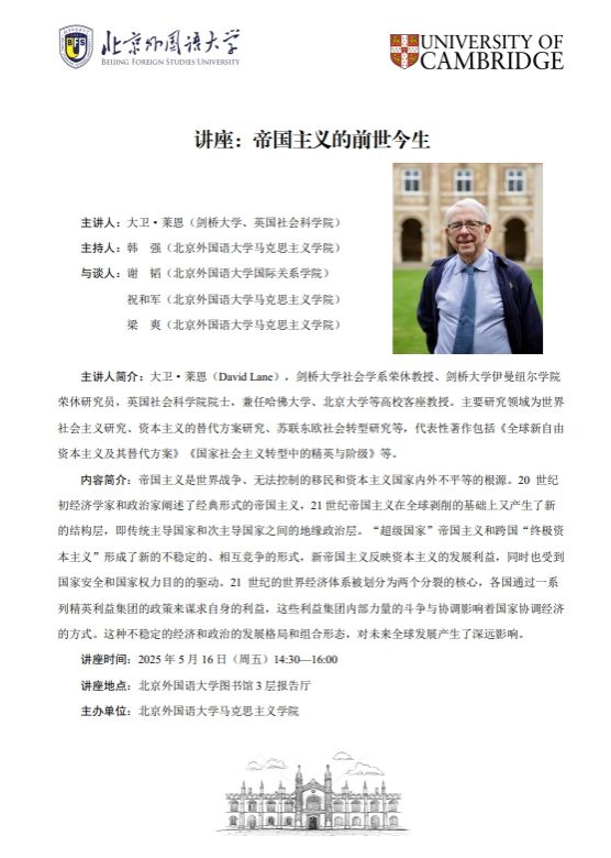 主讲人简介:大卫·莱恩(David Lane),剑桥大学社会学系荣休教授、剑桥大学伊曼纽尔学院荣休研究员,英国社会科学院院士,兼任哈佛大学、北京大学等高校客座教授。主要研究领域为世界社会主义研究、资本主义的替代方案研究、苏联东欧社会转型研究等,代表性著作包括《全球新自由资本主义及其替代方案》《国家社会主义转型中的精英与阶级》等。