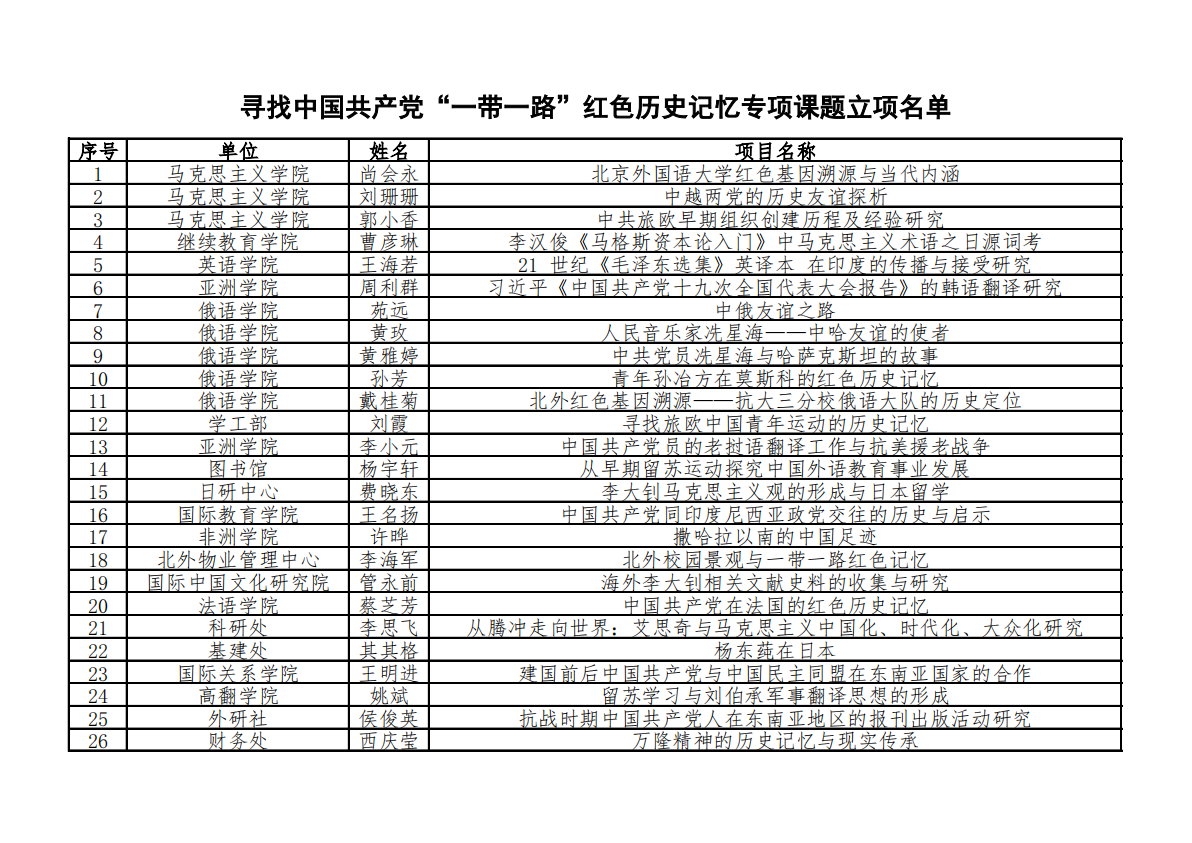 为贯彻习近平总书记在党史学习教育动员大会上的重要讲话精神,落实《中共中央关于在全党开展党史学习教育的通知》要求,结合北京外国语大学党史学习教育特色活动开展安排,经学校党史学习教育领导小组办公室研究决定,特设立“寻找中国共产党‘一带一路’红色历史记忆”专项课题。