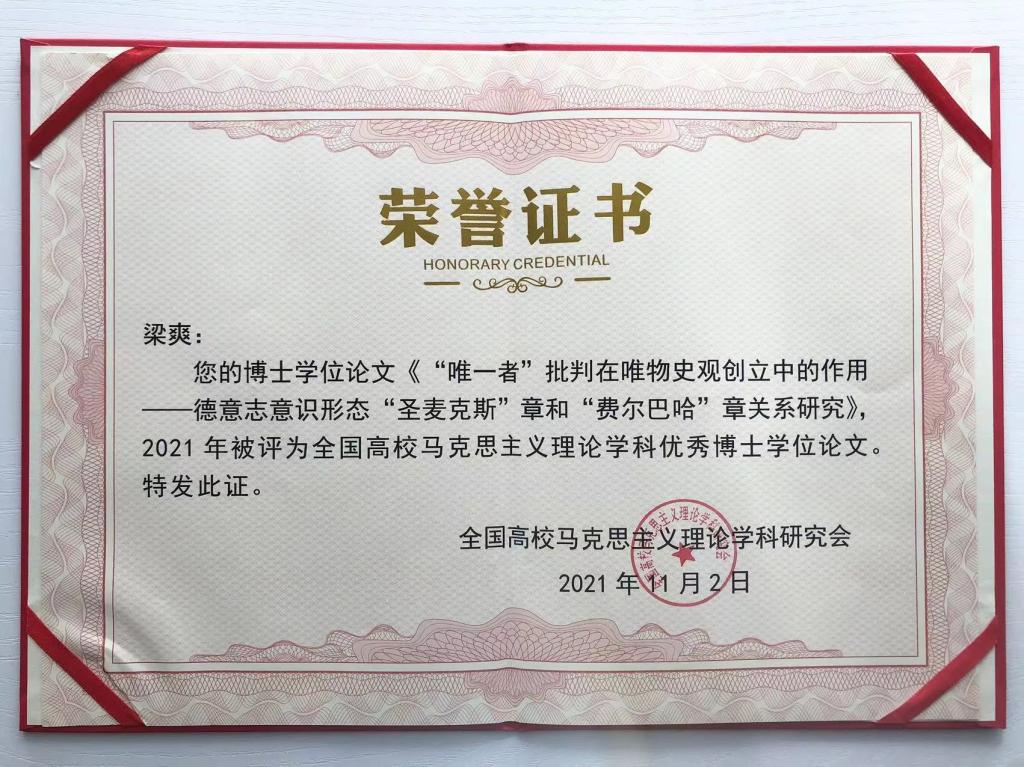 2023年11月4日,由全国高校马克思主义理论学科研究会主办的全国高校马克思主义理论学科博导论坛暨全国高校马克思主义理论学科优秀博士学位论文颁奖典礼在安徽师范大学举行,会议对2021—2023年度全国高校马克思主义理论学科优秀博士学位论文奖获得者进行了表彰。我院教师梁爽获此奖项。