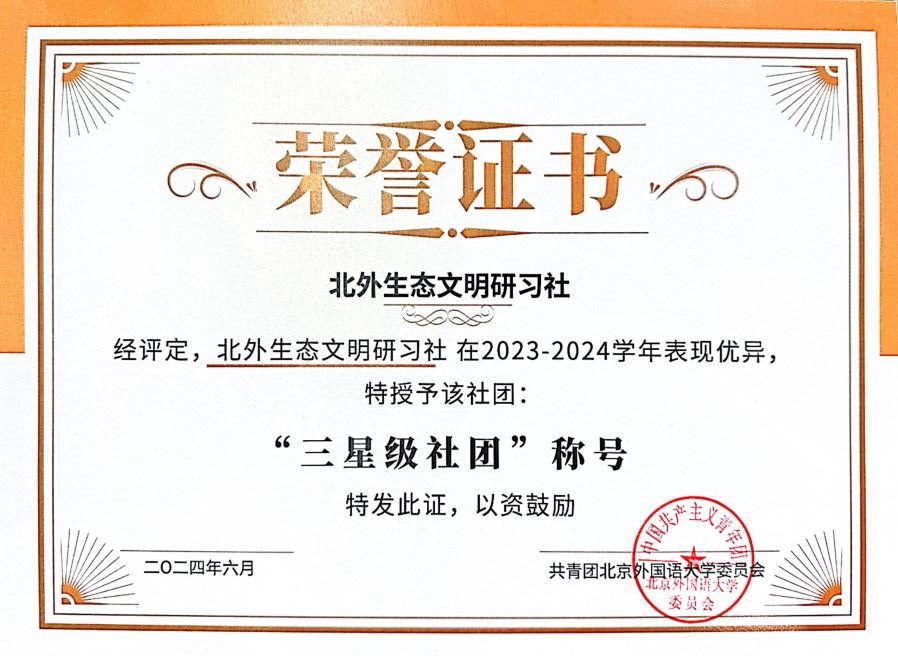 6月12日,北京外国语大学举行2023-2024学年社团星级大会。社团工作部对过去一年的社团工作进行了总结,并公布了星级社团评审结果。经评选,北外生态文明研习社荣获北京外国语大学2023-2024学年“三星级社团”称号。