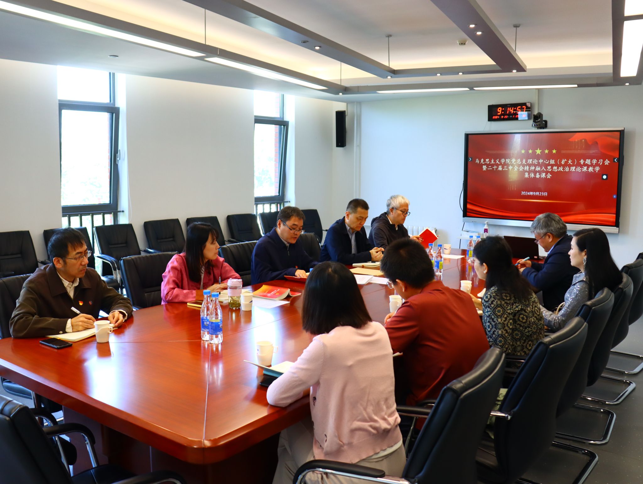 为学习贯彻党的二十届三中全会精神和全国教育大会精神,进一步推动党的二十届三中全会精神有机融入思政课教学,9月23日,亚洲国产精品无码久久影院召开党总支理论中心组(扩大)专题学习会暨党的二十届三中全会精神融入思政课教学集体备课会。学院党政班子成员,理论学习中心组成员、各教研室主任、教工党支部书记、学生党支部书记参加会议。会议由党总支委员、副院长王曼倩主持。